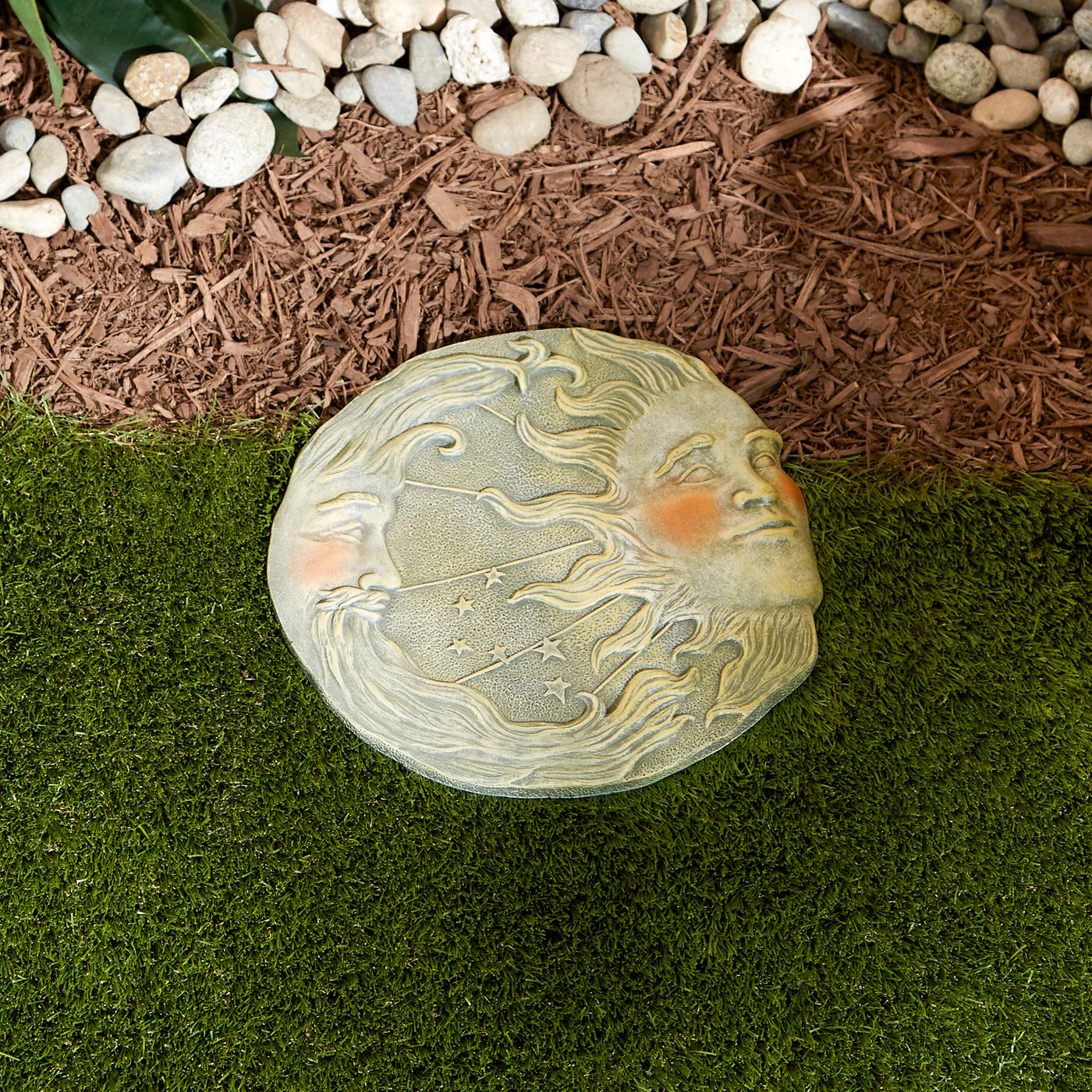 • An enchanting garden decoration featuring intricate details that lend to the astral glory of this starry stone-look moon and sun plaque.