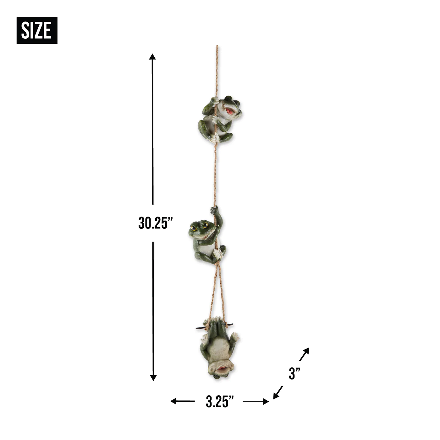 • A giggling trio of amphibious acrobats enjoys a merry moment of mirth, playfully tumbling down the length of a free-swinging rope. An utterly irresistible hanging sculpture that brings loads of love and laughter to your garden!