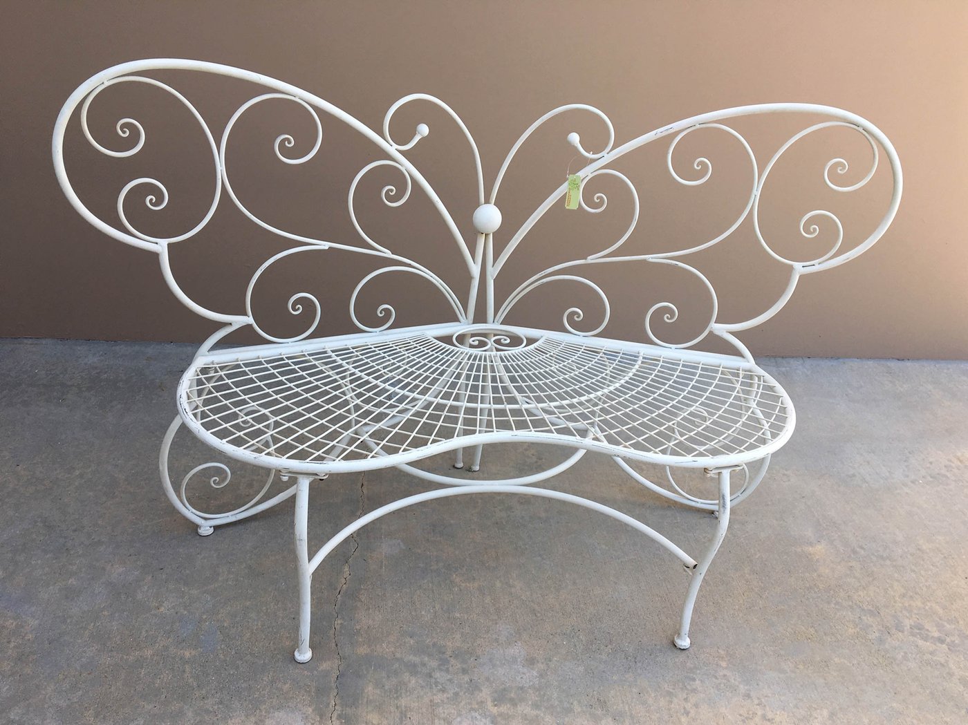 • Your garden can become a relaxing oasis with help from this beautiful butterfly bench. Featuring white painted iron shaped into a delicate butterfly, this bench is in shady spot under a tree or along a garden path for a place to relax and enjoy nature. Or sit side by side with a friend, sipping tea on a beautiful summer day. Max. weight limit: 440 lbs.